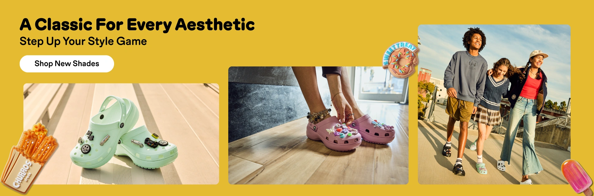 Classic Clog and SlidesAs our most popular and iconic shoe silhouettes, the Classic Clog and Slide come in a wide variety of colors and patterns, are easy to clean, and serve as the foundation of our exciting collaborations. Clogs also accommodate infinite amounts of personalization thanks to our ever-changing collection of Jibbitz™ shoe charms.